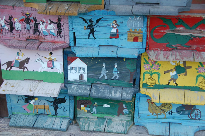 The Slovenian landscape would not be the same without the thousands of bee houses that pepper roadsides and small mountain villages. Slovenians have painted their beehive panels for centuries, with the idea that bees have better orientation when panels are painted bright colors. When the paintings first appeared, the themes were drawn from Biblical imagery, held in high regard by a strongly Catholic population. After Slovenia’s entry into Yugoslavia, organized religion was banned and panel images depicted more cultural and landscape scenes rather than religious ones prior.